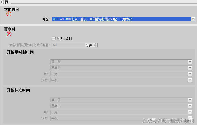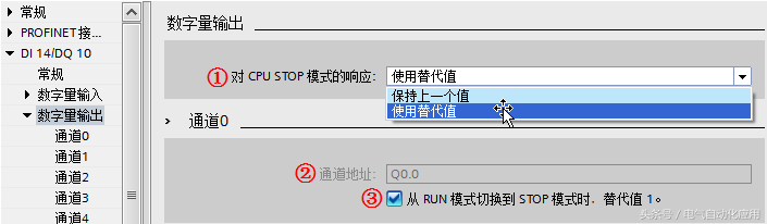③“从RUN 模式切换到 STOP 模式时,替代值1”:如果在数字量输出设置中,选择“使用替代值”,则此处可以勾选,表示从运行切换到停止状态后,输出使用“替代值1”,如果不勾选表示输出使用“替代值0”。如果选择了“保持上一个值”则此处为灰色不能勾选。