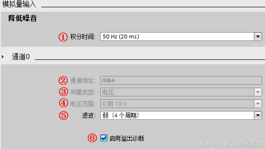⑤“滤波”:模拟值滤波可用于减缓测量值变化,提供稳定的模拟信号。模块通过设置滤波等级(无、弱、中、强)计算模拟量平均值来实现平滑化。