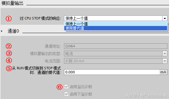 ①“对CPU STOP 模式的响应”:设置模拟量输出对CPU 从RUN模式切换到 STOP 模式的响应,可以设置为保留最后的有效值或者使用替代值;