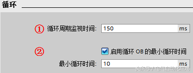 ①“循环周期监视时间”:设置程序最大的循环周期时间,范围为1~6000 ms,默认值为150 ms。超过这个设置时间,CPU会报故障。超过2倍的最大循环周期检测时间,无论是否编程时间错误中断OB80, CPU都会停机。在编程了时间错误中断OB80后,当发生循环超时时CPU将响应触发执行OB80的用户程序,程序中可使用指令“RE_TRIGR” 来重新触发 CPU 的循环时间监控,最长可延长到已组态“循环周期监视时间”的10倍;