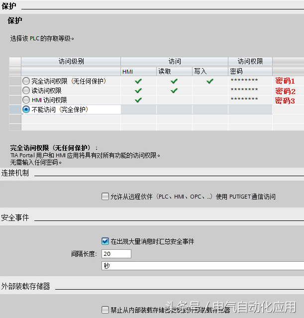 "保护":此界面可以设置该PLC的访问等级,共可设置4个访问等级,设置”连接机制”,通过 PUT/GET 通信的数据访问,设置 “安全事件”和“外部装载存储器“。如图 13 所示。