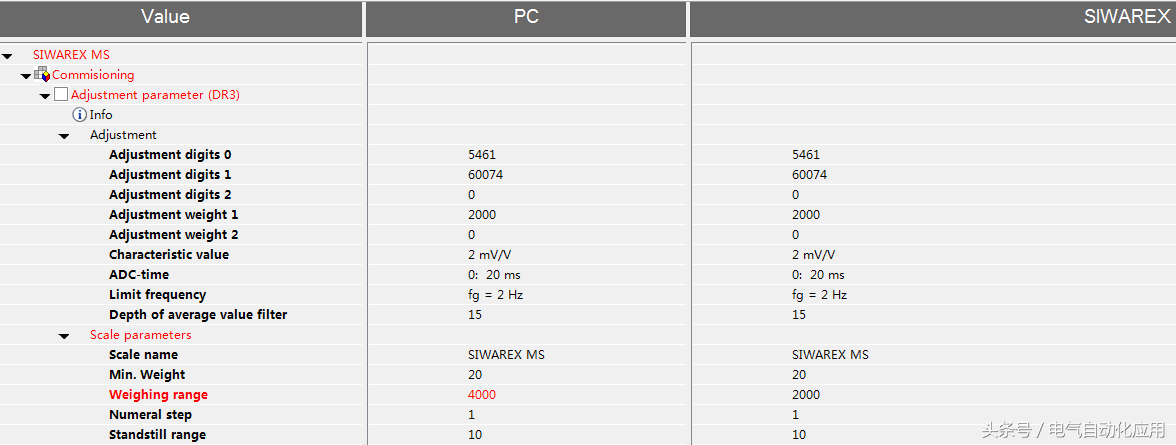 PC列参数表示SIWATOOL软件中的参数设置,SIWAREX列为称重模块内实际设置的参数,当二者不一致时,参数为红色。