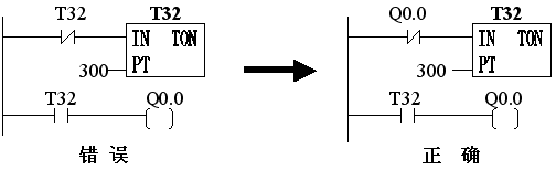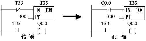 说明:对10ms定时器T33,在使用错误方法时,Q0.0永远产生不了这个脉冲。定时器在每次扫描开始时刷新。该例中T33被置位,但执行到定时器指令时,定时器将被复位(当前值和位都被置0),当开触点T33被执行时,T33永远为OFF,Q0.0也将为OFF,即永远 会被置位ON。