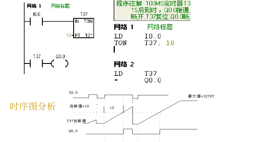 100ms的定时器在执行指令时刷新,所以当定时器T37到达设定值时Q0.0肯定会产生这个脉冲。在使用定时器时,要弄清楚定时器的分辨率,否则,一般情况下不要 把定时器本身的常闭触点作为自身的复位条件
