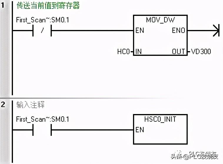 第一步: (除了第一个扫描周期之外的其它周期,需要将高速计数器0的当前值HC0传送到寄存器VD300中)