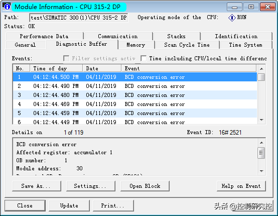 这两个图详细说明了,因为程序第一行的BCD_I指令出现错误,所以系统报错了。报错的真是原因是什么呢?就是整数10被转为了16#0a,而BCD码的基本概念是用4位二进制数表示0-9这10个十进制数,因此BCD #160a是非法的,它不能被看作是一个BCD码。