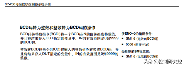 所以,到这里BCD_I指令,BCD输入端其实是16进制下的BCD值,BCD_I指令更加准确的描述应该是将16进制BCD码转化为为整数,不知道帮助文件或者西门子200的手册为何没有强调这个16进制。下图是手册上的解释: