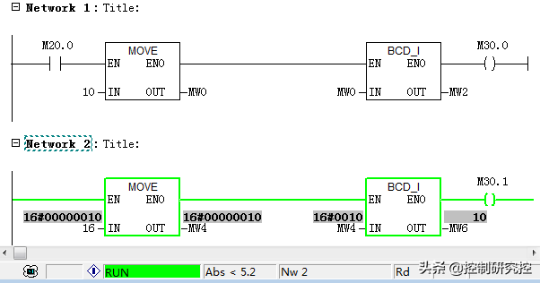 这个图片是值运行程序第2行,整数16通过BCD_I指令后结果也是10,证明是和西门子200中的算法一样的。
