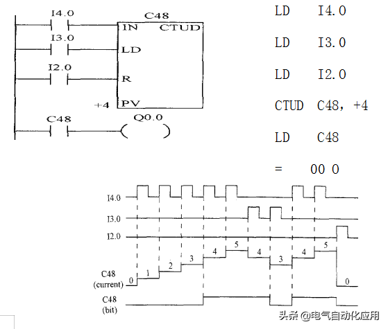 例如,某段PLC梯形图程序中计数器类型为CTUD,增减计数器,编号为C48,预设值PV为4,如图3-22所示。
