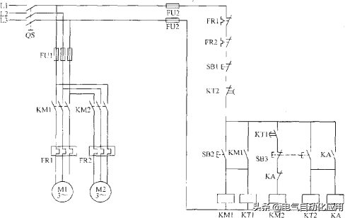图2.1为两台电动机顺序起动逆序停止的控制电路图。按下起动按钮SB2,第一台电动机M1开始运行,5s之后第二台电动机M2开始运行;按下停止按钮SB3,第二台电动机M2停止运行,10s之后第一台电动机Ml停止运行;SBl为紧急停止按钮,当出现故障时,只要按下SBl,两台电动机均立即停止运行。