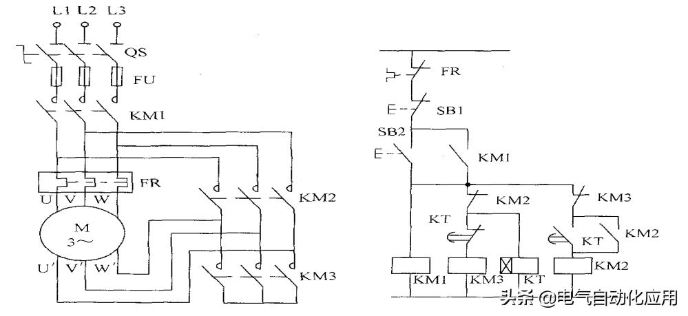 图3.1为三相异步电动机Y-△减压起动的原理图。KMl为电源接触器。KM2为△联结接触器,KM3为Y联结接触器,KT为起动时间继电器。其工作原理是:起动时合上电源开关QS,按起动按钮SB2,则KMl、KM3和KT同时吸合并自锁,这时电动机接成Y联结起动。