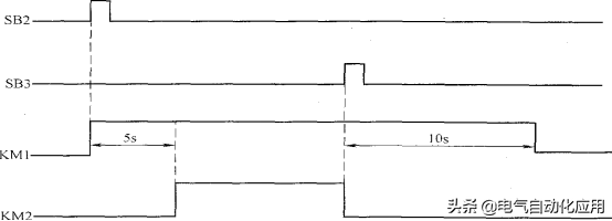 根据I/0地址分配及控制时序图可知,当起动按钮SB2被按下时,输入继电器I0.1接通,输出继电器Q0.0置1,交流接触器KMl线圈得电并自保,这时第一台电动机M1运行,5s之后输出继电器Q0.1置1,第二台电动机M2。