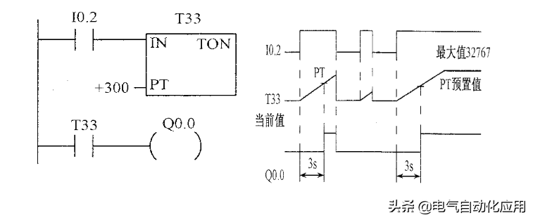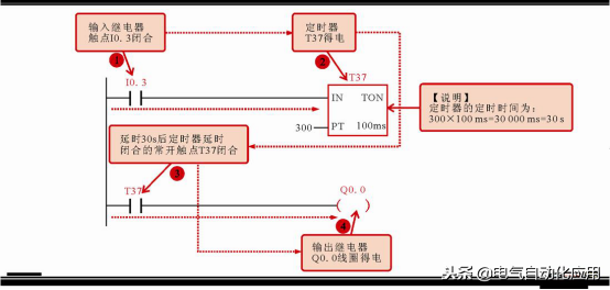 可以计算出,该定时器的定时时间为300×100ms=30000ms=30s;则在该程序中,当输入继电器I0.3闭合后,定时器T37得电,延时30s后控制输出继电器Q0.0的延时闭合的常开触点T37闭合,使输出继电器Q0.0线圈得电。