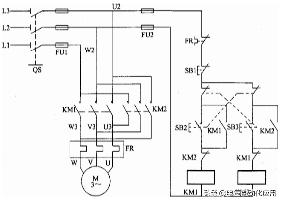 当电动机需要反转时,按下反转控制按钮SB3,KMl线圈断电,KM2线圈得电,KM2的常开触点闭合,电动机反转并实现自锁,按钮SBl为总停止按钮。