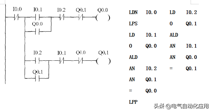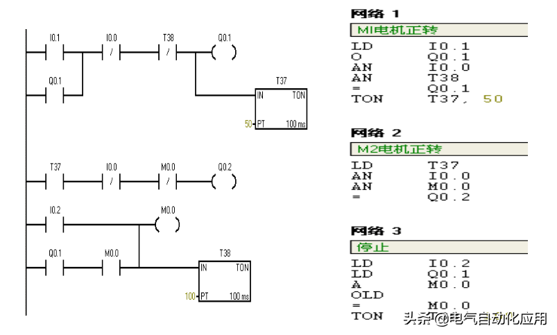 开始运行;当按下停止按钮SB3时,输入继电器I0.2接通,输出继电器Q0.1置0,第二台电动机M2停止运行,10s之后输出继电器Q0.0置0,第一台电机停止运行。梯形图及语句表如图所示。
