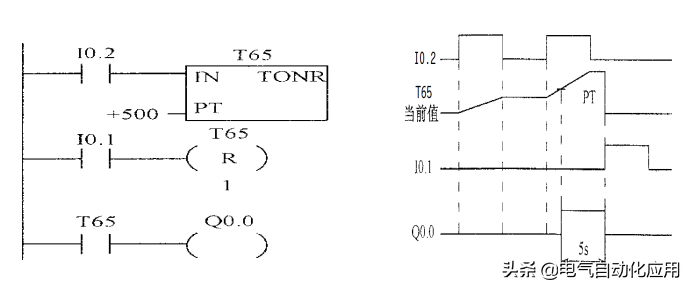 ②保留性接通延时定时器(TONR)的标注。保留性接通延时定时器(TONR)与上述的接通延时定时器(TON)原理基本相同,不同之处在于在计时时间段内,未达到预设值前,定时器断电后,可保持当前计时值,当定时器得电后,从保留值的基础上再进行计时,可多间隔累加计时,当到达预设值时,其触点相应动作(常开触点闭合,常闭触点断开)。