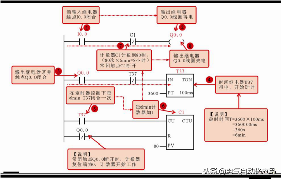 可以看到,该程序中,初始状态下,输出继电器Q0.0的常闭触点闭合,即计数器复位端为1,计数器不工作;当PLC外部输入开关信号使输入继电器I0.0闭合后,输出继电器Q0.0线圈得电,其常闭触点Q0.0断开,计数器复位端信号为0,计数器开始工作;同时输出继电器Q0.0的常开触点闭合,定时器T37得电。