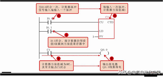 ②减计数器(CTD)的标注。减计数器(CTD)是指在计数过程中,将预设值装入计数器当前值寄存器,当计数端输入一个脉冲式时,当前值减1,当计数器的当前值等于0时,计数器相应触点动作(常开触点闭合、常闭触点断开),并停止计数。