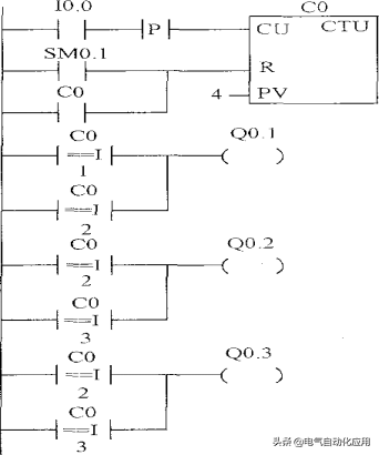 例如,某段PLC梯形图程序中计数器类型为CTU,增计数器,编号为C1,预设值PV为80,复位端由输出继电器Q0.0的常闭触点控制,如图3-18所示。