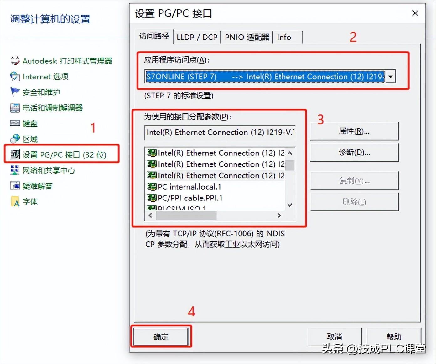 这一步非常的重要,如果你的电脑的PGPC访问接口设置不对也会导致你的软件连接不上PLC。