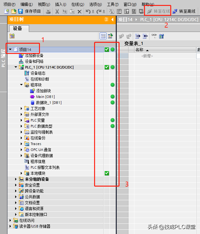 下载以后在图15中的步骤选择启动模块,按照图16步骤转至在线,转至在线成功如图16步骤3所示。