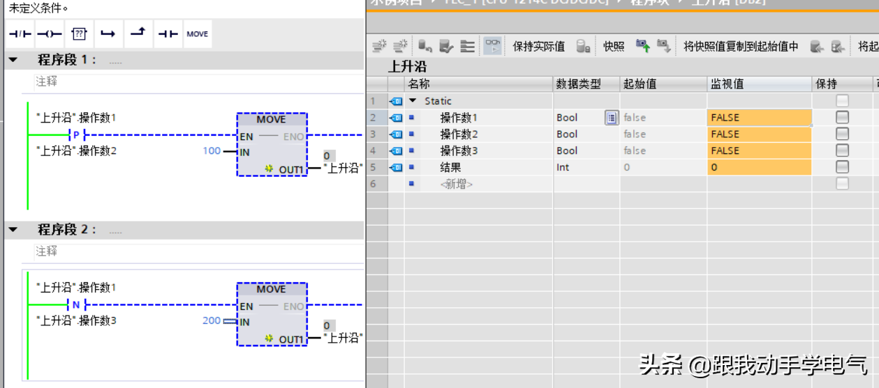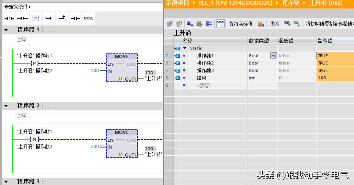 当信号状态变为1,也就是说操作数1由0变为1,与上一次的信号状态进行比较(操作数2为0),所以,出现一个上升沿,则赋值100,如图2所示