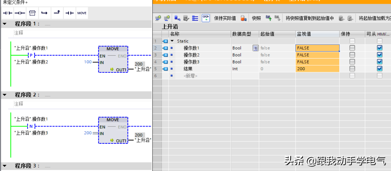 当信号状态变为0,也就是说操作数1由1变为0,与上一次的信号状态进行比较(操作数3为1),所以,出现一个下降沿,则赋值200,如图3所示