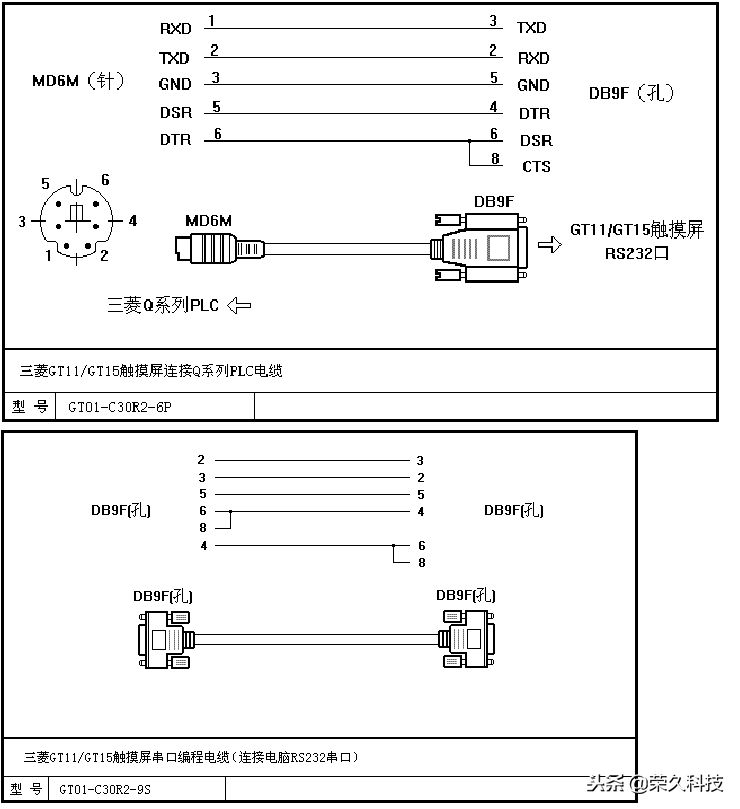 三菱GT11/GT15触摸屏连接Q系列PLC电缆。