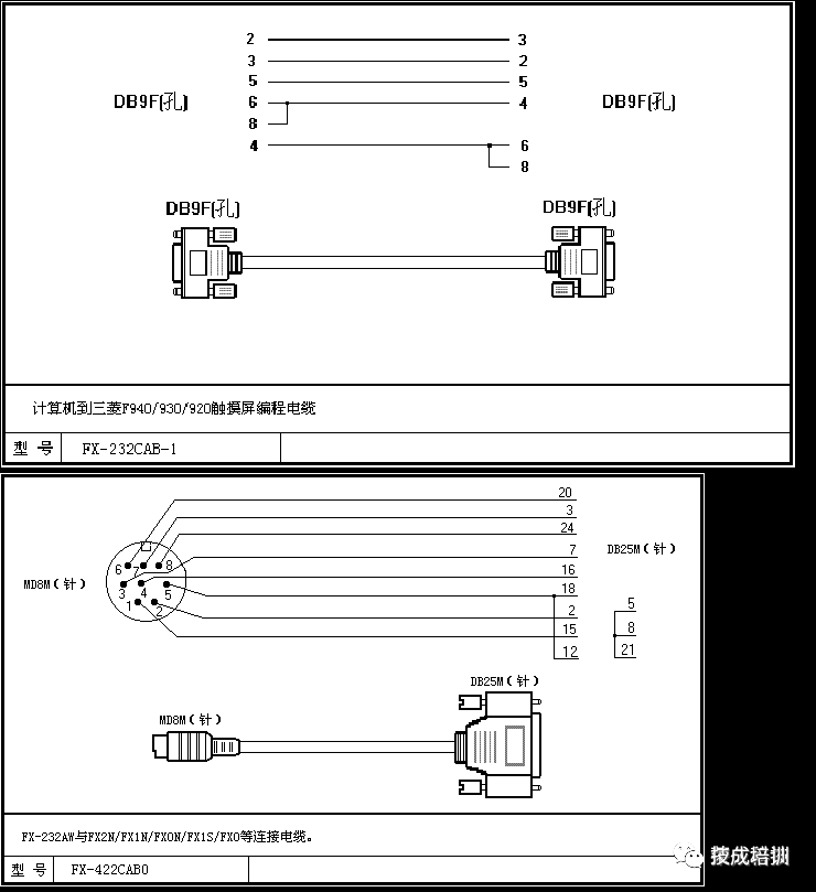 三菱FX2/A系列PLC同人机介面F940/F930/F920相连电缆。