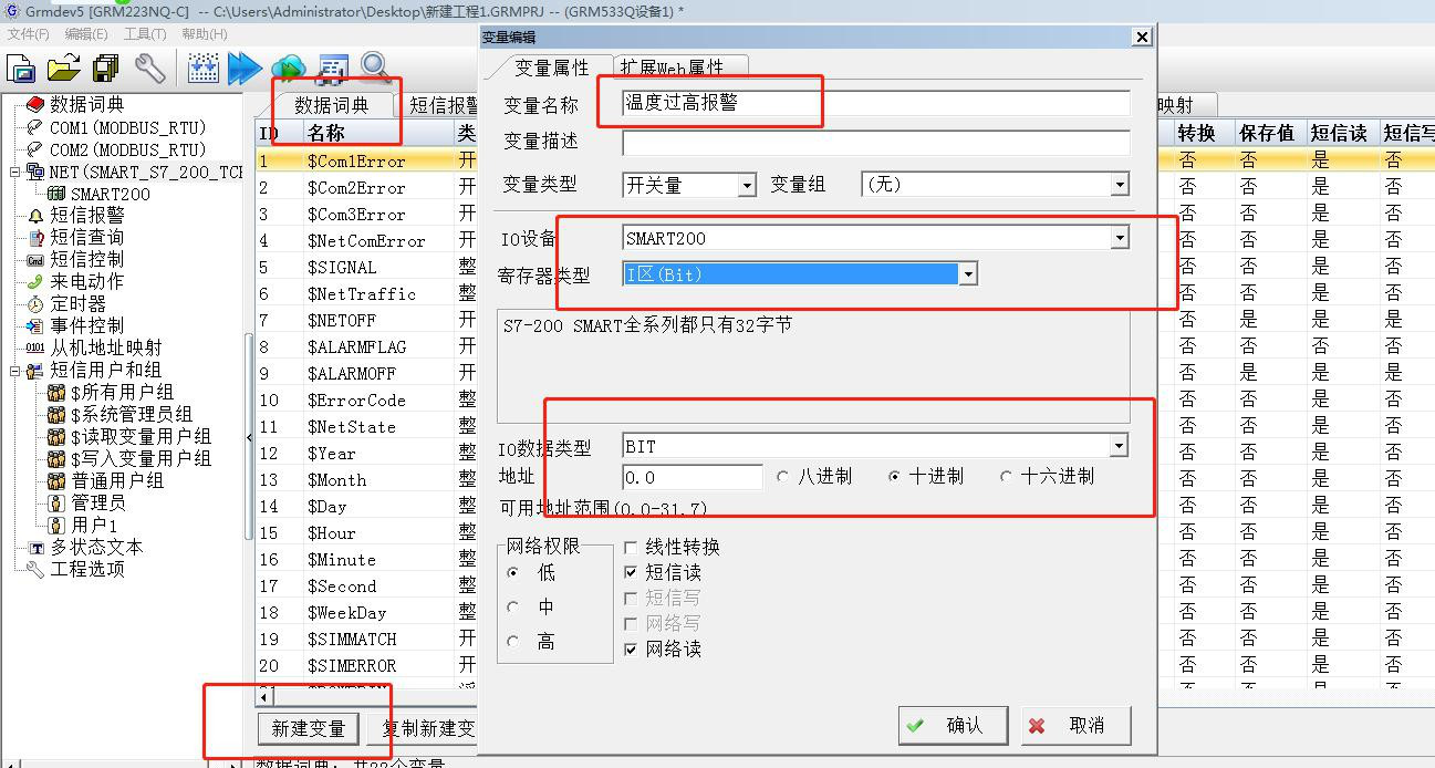 如上图数据词典栏里:新建变量关联 IO 设备:SMART 200plc 名称填上:温度过高报警对应关联到 PLC 的寄存器地址:I 区(BIT)0.0,水箱液位关联 PLC 的寄存器地址:VD100.此处组态类似上位机触摸屏和组态软件的变量地址关联。