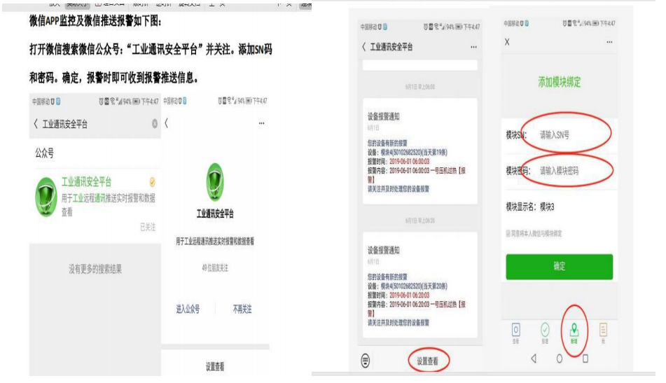 然后打开微信关注公众号,把模块的 SN 和密码填进去即可,一有报警时即可收到微信报警信息。