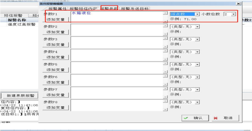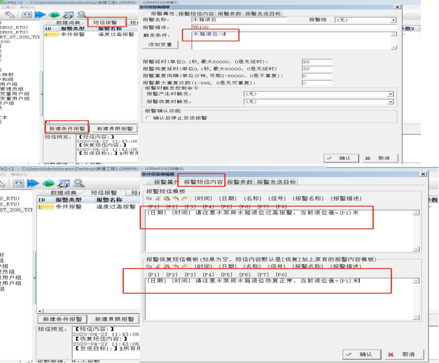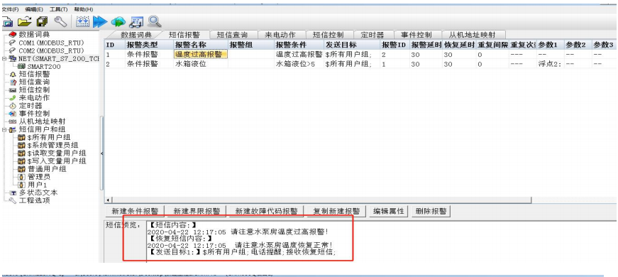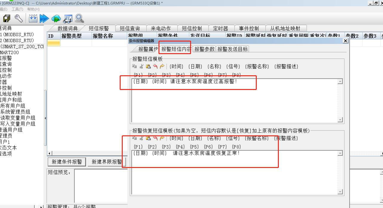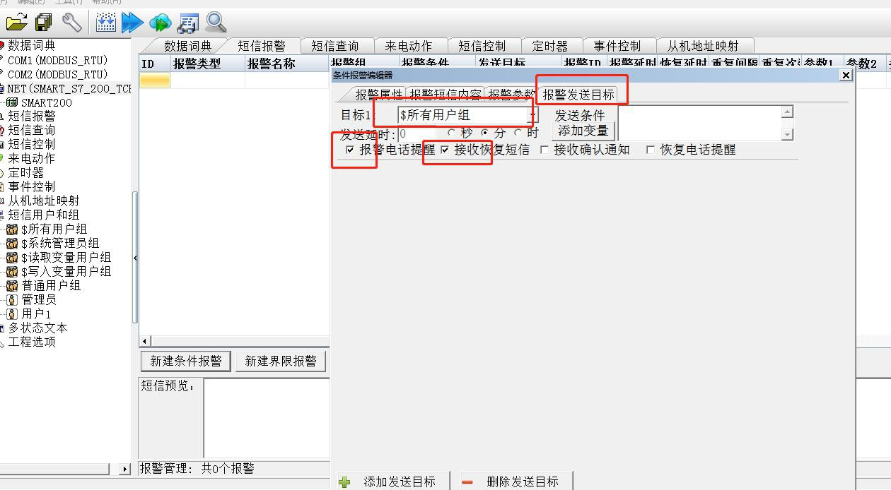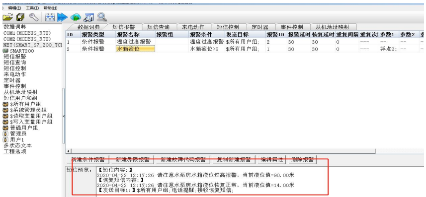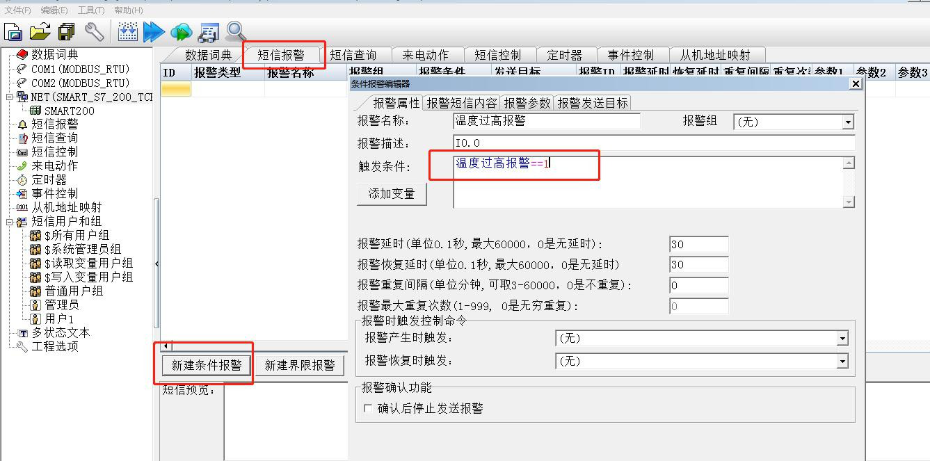 把所有要触发报警的变量全部关联出来。然后跳到短信报警栏,配置触发的条件以及报警所发的短信内容。