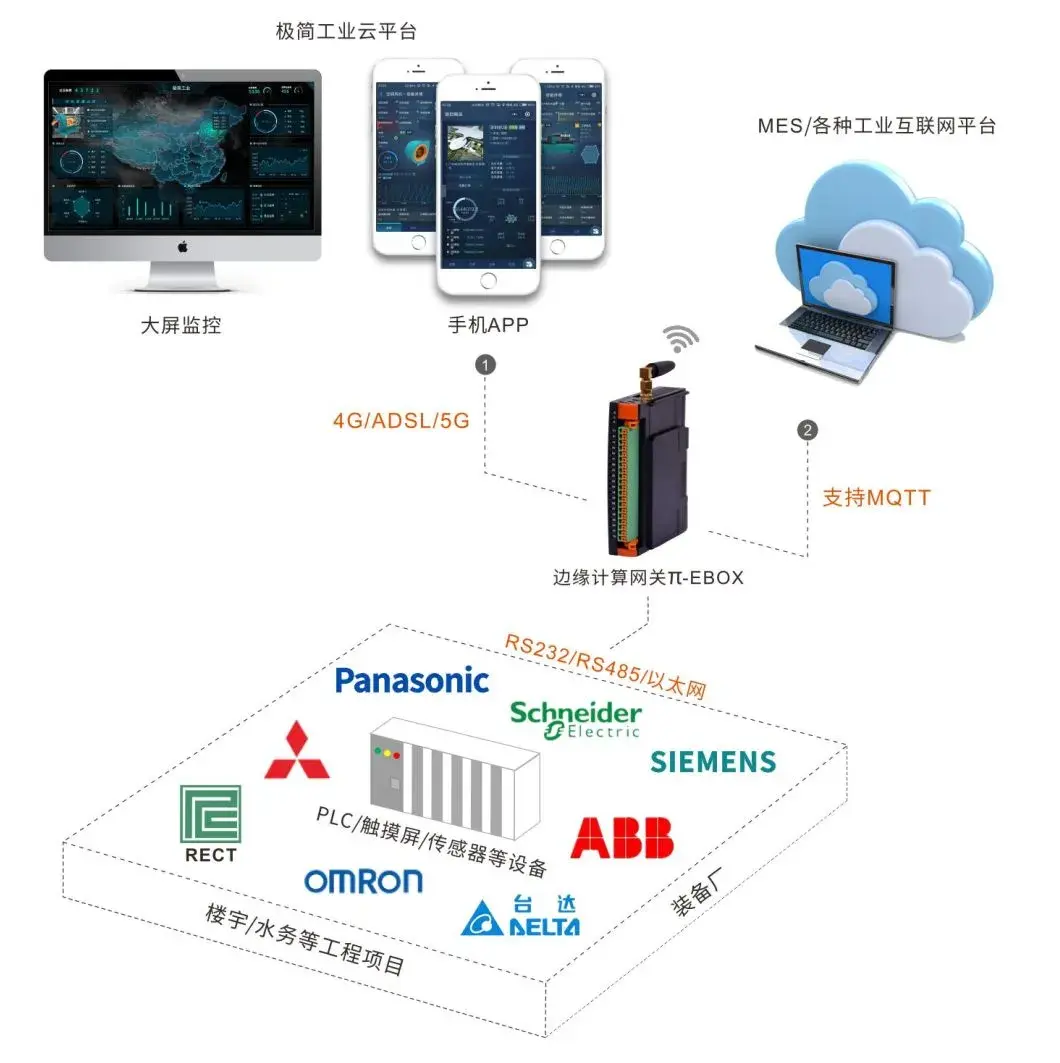1)支持多种品牌PLC接入,如西门子、三菱、施耐德、欧姆龙、松下、台达、矩形等;