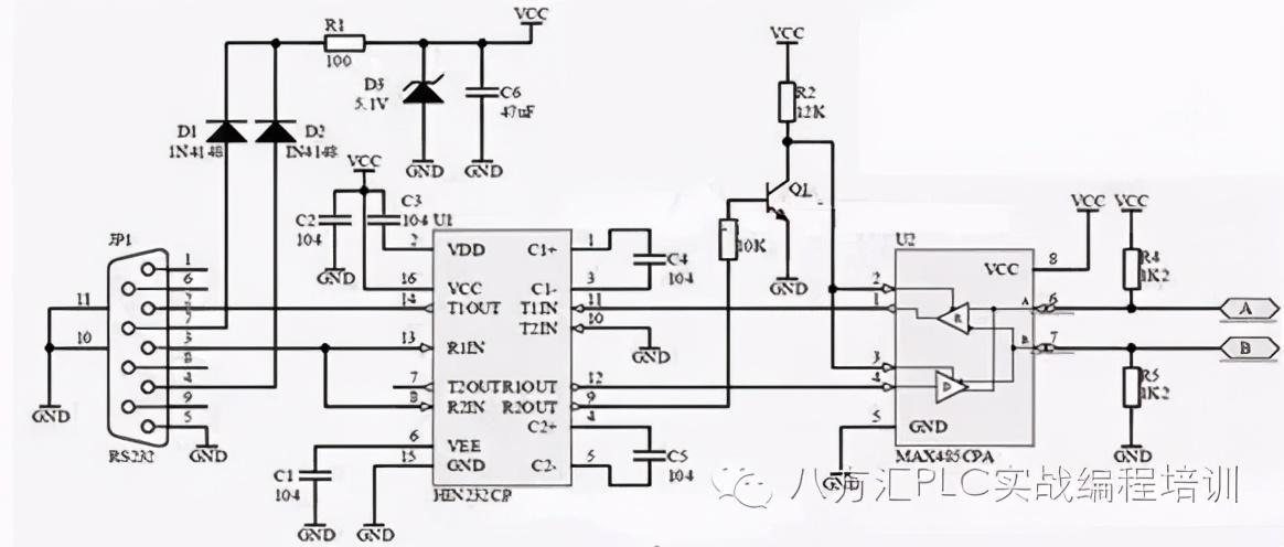 一种原装电缆只能在一种PLC上使用,而一只接口转换器配上不同接插件可以组合成一套编程电缆,几乎可以在任何品牌的PLC上使用。接口转换器和接插件在通信市场都能买到,而且价格便宜,总成本仅需原装电缆价格的十分之一左右,制作也非常简便。自制的编程电缆可以在PC与PLC之间可以完成程序上传、下载、在线监控等功能,在功能和可靠性上比起原装电缆来可以说是毫不逊色。RS232转RS485自制线原理图