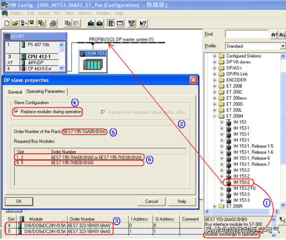 STEP1:在STEP7的硬件组态窗口的PROFIBUS DP目录中选择相应IM153模块,可以看出该模块支持“module exchange in opration”(热插拔);