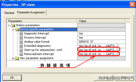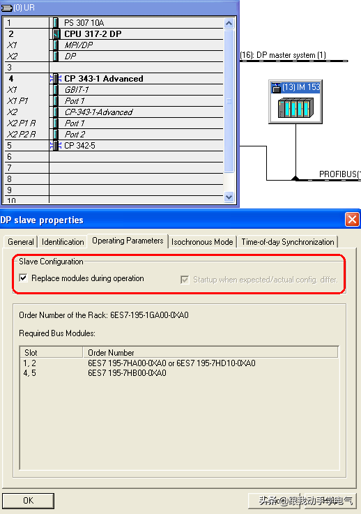 如果您采用CP342-5模块作为DP主站,那么您可以直接在IM153的属性窗口的"Operating Parameters"标签页里配置热插拔功能。 如下图所示。同样如果使用GSD文件组态,要实现热插拔功能也必须使用DPV0。