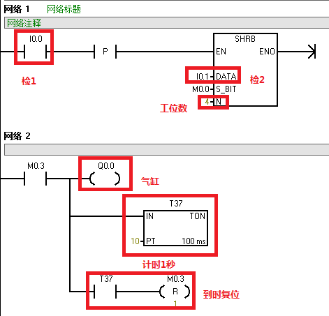 这里,需要说明的一点是,在I0.0收到信号时(检测到产品时),I0.1的值可以是1(检测到次品),也可以是0(良品)。为了验证我们程序是否能够按照要求,就将检测到的次品,及时推出去。