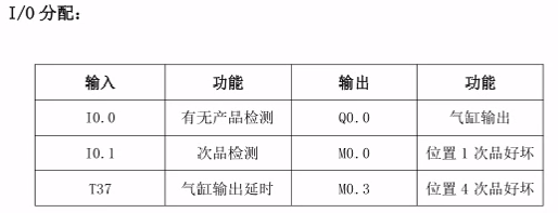 产品检测分拣机,输送带上的产品经过一台检测装置时,检测装置输出检测结果到I0.0,有产品时为1;I0.1检测产品的好坏,若I0.1为0则产品是好的;若I0.1为1则产品是坏的;在第四个产品位置有一个推出产品的气缸Q0.0。若检测的产品为坏时,到达第四个产品位置时,Q0.0输出气缸动作,产品被推出,1S后气缸断电退回,传送带继续工作,进行产品的检测。