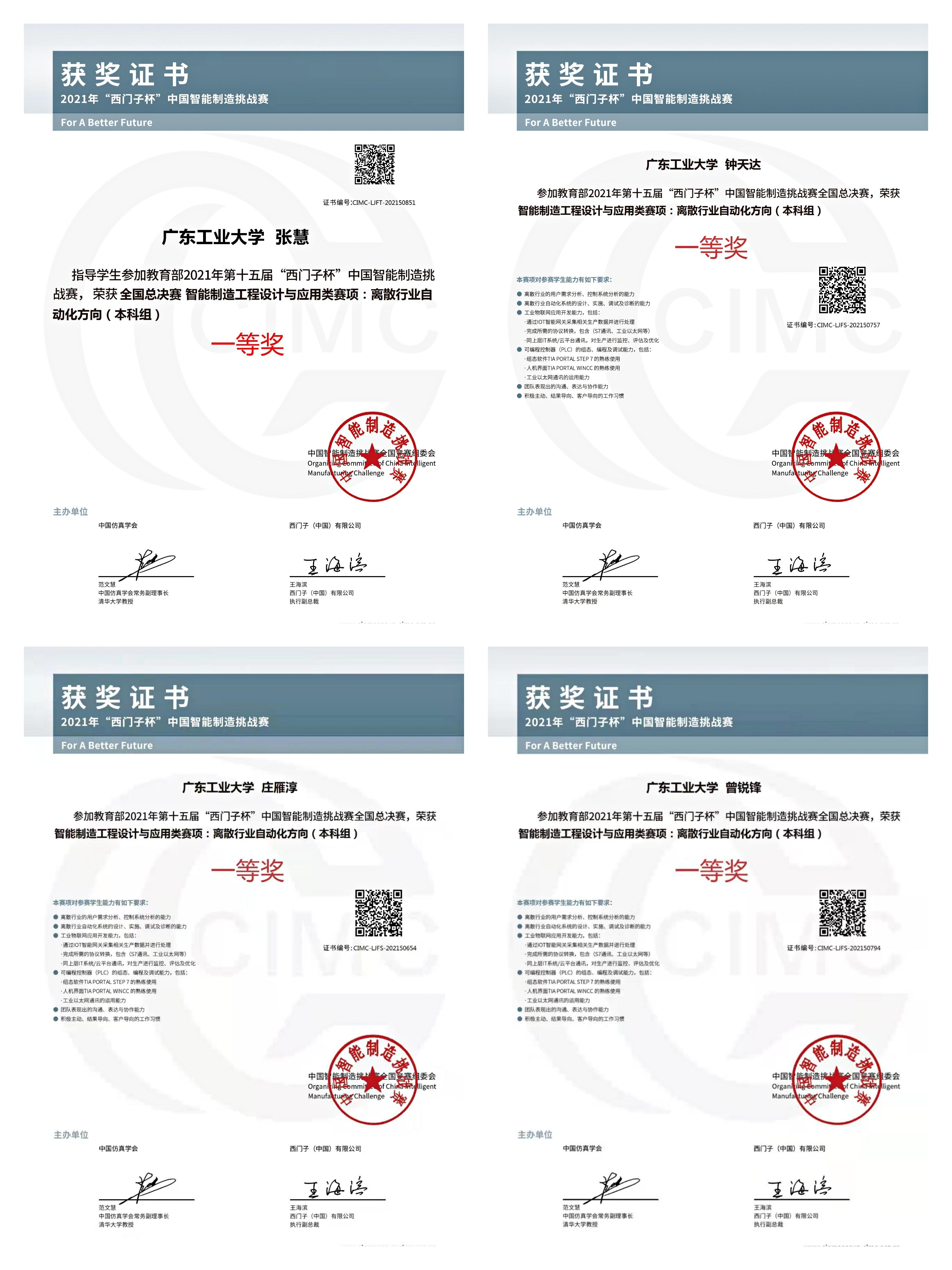 日前,第十五届“西门子杯”中国智能制造挑战赛(CIMC)全国总决赛落幕,我校学子在本届比赛的离散行业自动化方向中表现出色。在自动化学院教师张慧的带领下,4支队伍参与全国初赛,在华南一赛区获得了1项特等奖、3项一等奖,其中特等奖队伍成员钟天达、庄雁淳、曾锐锋代表广东工业大学 参加了全国总决赛,并获得全国一等奖。