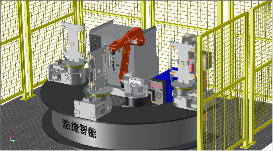 3.1本设备采用单个工业机器人每个工件搭配三套夹具进行焊接。一边焊接时另一边可以装夹,机器人一直在工作效率最高。由于考虑焊缝较长,工件下料精度偏差等问题,可选配配置接触寻位系统以增加焊接精度和设备的适用性。