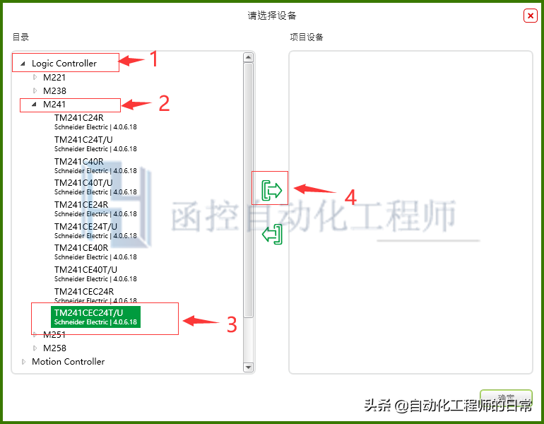 在硬件组态对话框中,依照如下所示的顺序选择,导入PLC硬件;