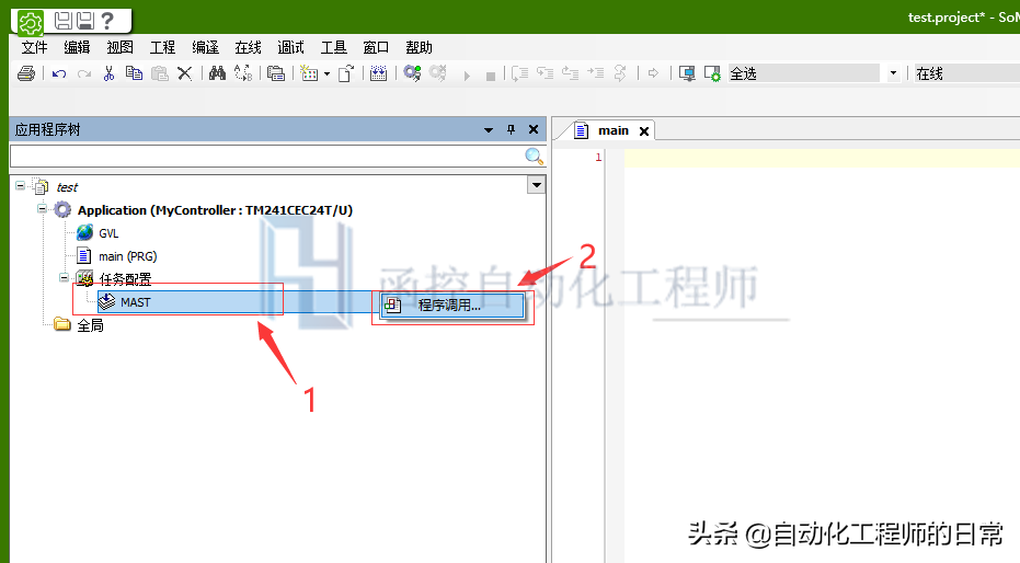 在界面左侧的“应用程序树”中,任务设置-MAST的右侧点击“+”,在弹出的快捷菜单中,选择“程序调用…”;