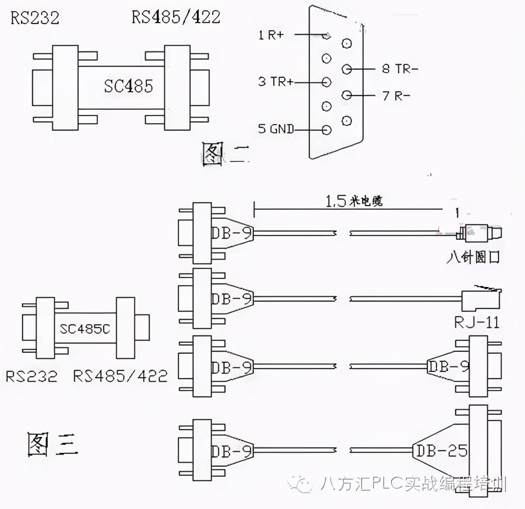 各厂家的编程电缆的作用就是将PLC端的RS485、RS422格式的数据转换为PC端的RS232C格式的数据,PLC端如果是RS232则只要按规则直接连接即可。因此要自制PLC编程电缆,就必须将PLC端的RS485、RS422转换为PC机能够识别的RS232C,PC才能与PLC通信,完成下载、上传、监控等工作,这就涉及到一个接口标准转换的问题。实现接口转换有几种方法:一是用简易的电平转换电路,但一种电路只能针对一种PLC,且功能不全,性能也不太可靠,甚至可能会损坏PC机的串口;二是用专用的接口转换IC ,但业余实现起来比较复杂,不适合自制。这里我们使用一种成品通讯接口转换器,可以实现RS232/RS485/RS422的转换,由于是专用的通讯接口转换器,使用起来很方便且性能可靠,价格也比较低。该类产品市场上比较多,以四川德阳四星电子的产品SC-485C接口转换器为例,该转换器用于RS232到RS485/RS422的通讯转换,体积小巧,只有两个DB-9插头大小,采用串口窃电技术,不需外接电源。SC-485C的结构及引脚定义如图二所示。RS232端为DB-9的孔座,可以直接插在PC机的COM口上,RS485/RS422端为DB-9的针座, RS485时使用3脚和8脚, RS422时用3脚、8脚、1脚和7脚。利用该接口转换器制作编程电缆如图三所示。左侧为SC-485C接口转换器,右侧从上而下分别为DIN-8、RJ11、DB-9和DB25插头的编程电缆,电缆靠近接口转换器一边的插头均为DB-9孔型插头,另一头均为针插头,分别对应不同物理结构的PLC编程口。