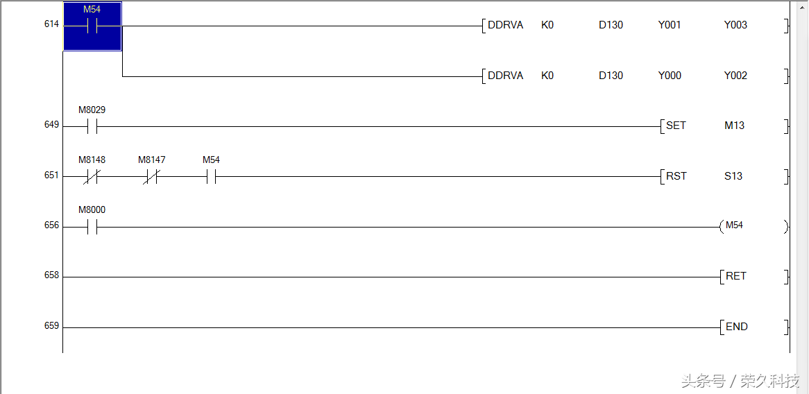 第二行为编码器清零,此文中的编码器为相对式。第三行为控制输出行,其中START端子应该由上升沿控制,文章中的是一个往复运动的例子。除了以上三个程序指令,运动控制还有其他功能,等着您来探索。
