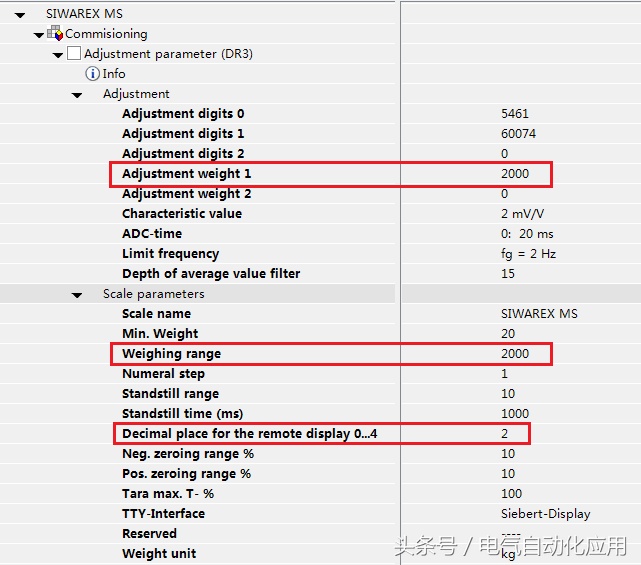 Adjustment weight 1:标定砝码重量,因为SIWAREX MS只能通过一个Word来存储重量,无法显示小数点,所以此处输入砝码重量时需要考虑小数点个数。此处输出2000,如果小数点个数为2,那么代表标定砝码重量为20.00