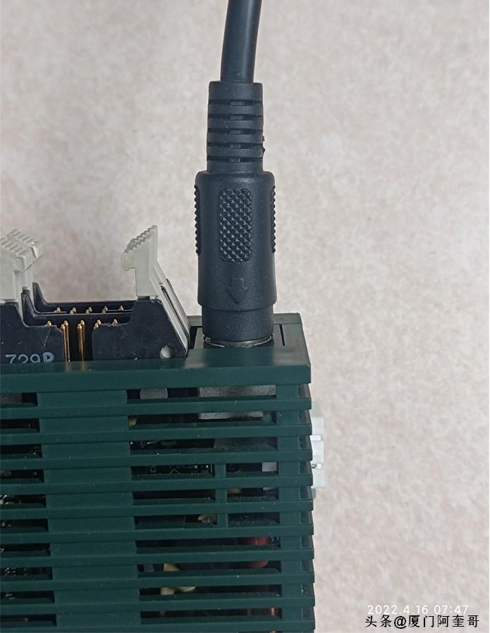1、我们先把硬件连接起来,将通信线的圆孔插在PLC上的通信口,要注意孔要对好,否则会把数据线的针插坏。