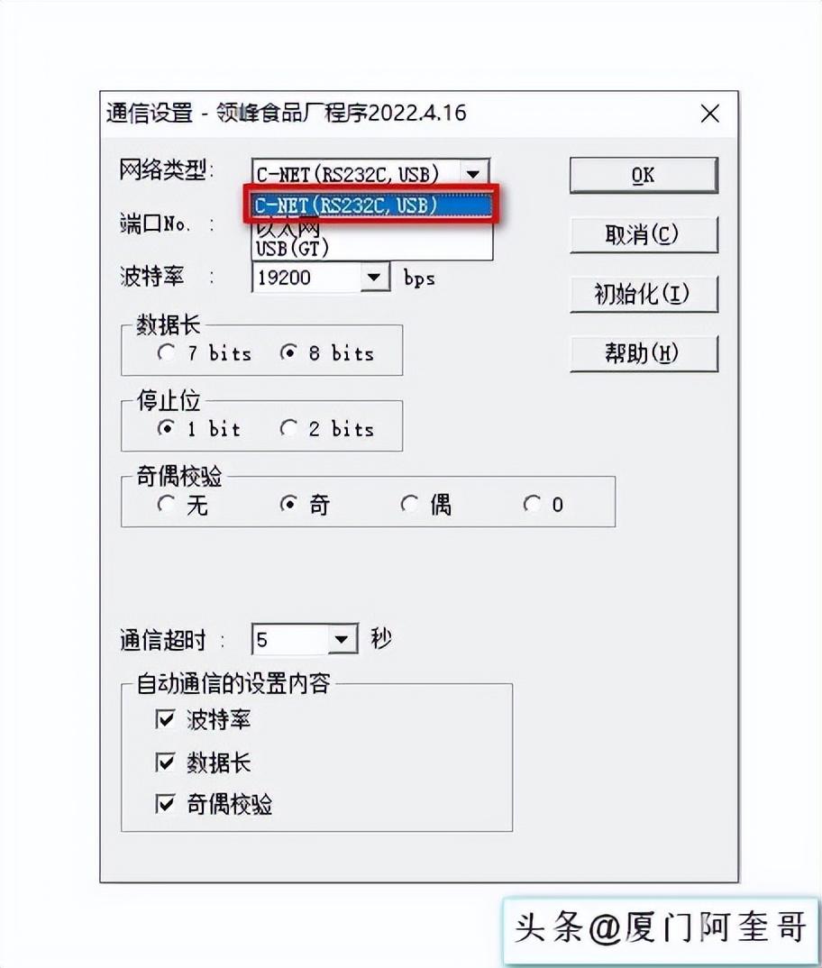 5、端口No.:选择COM7,其它默认:波特率19200,数据长8,停止位1 bits,奇偶校验奇。然后点击OK,完成设置。