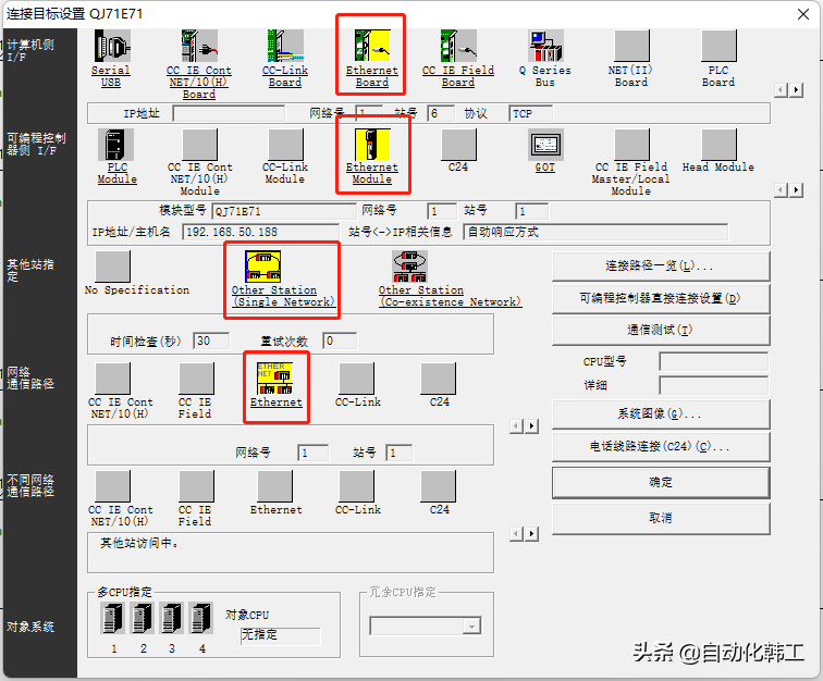 点击计算机侧的连接方式Ethernet Board,设置网络号和站号,网络号和以太网模块一致 ,站号与以太网模块不一致 。