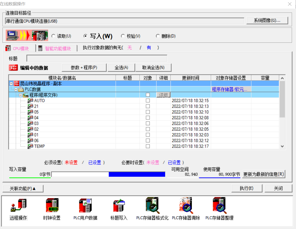 在数据操作页面下,可以对PLC本体进行一系列的操作,可以格式化,可以远程RUN或STOP等等。如果是第一次写入程序,建议先对PLC进行存储器清除和格式化一下。整理好的PLC点击【参数+程序】,就将程序和PLC参数全部勾选上了(二次下载可以只下载修改内容)。