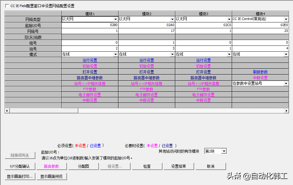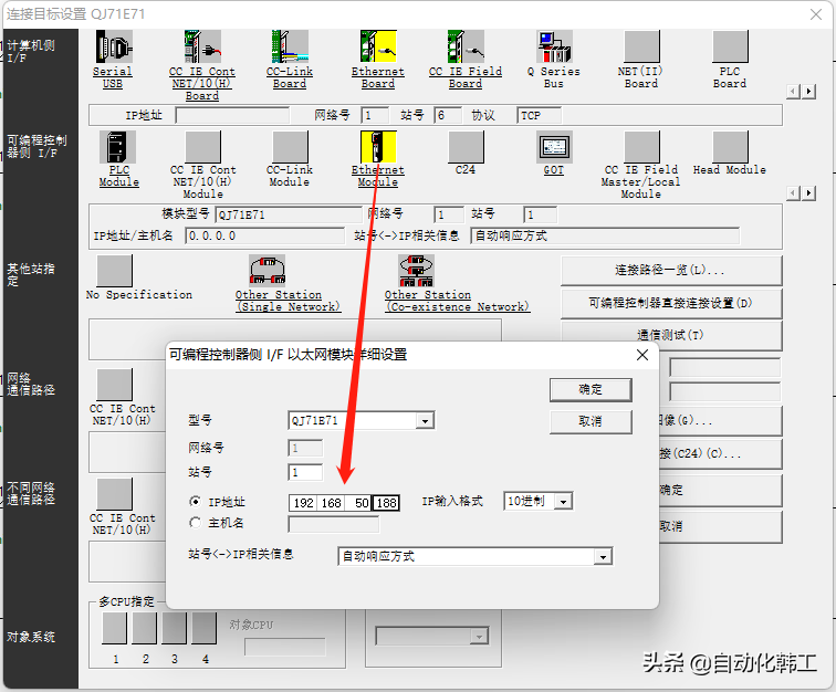 可编程控制器侧,选择Ethernet Module,设置站号、IP地址,这里的站号要与以太网模块的站号一致。